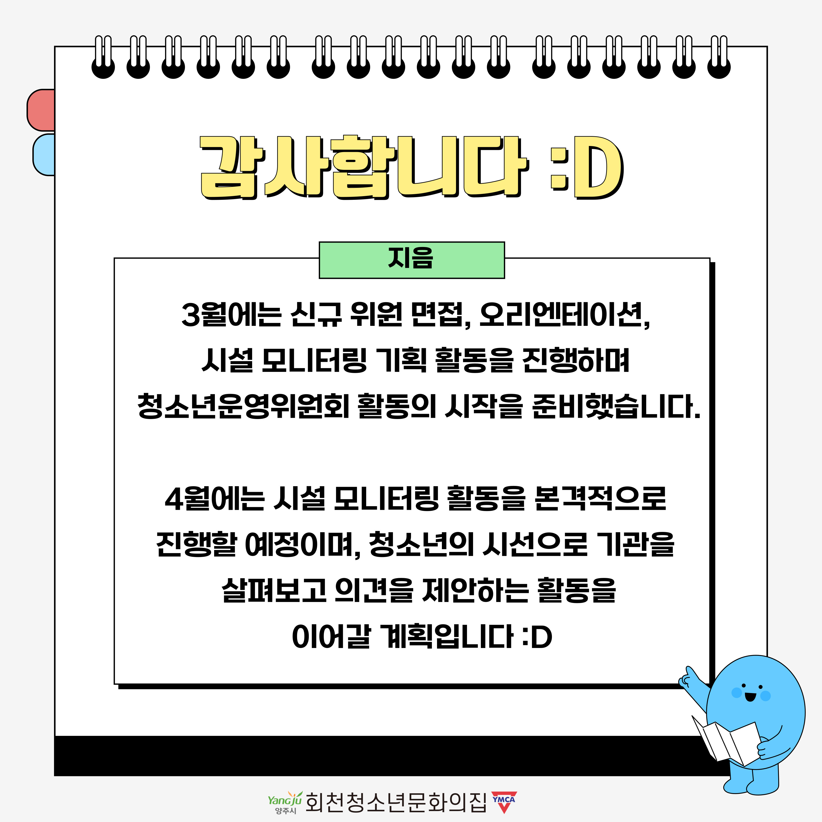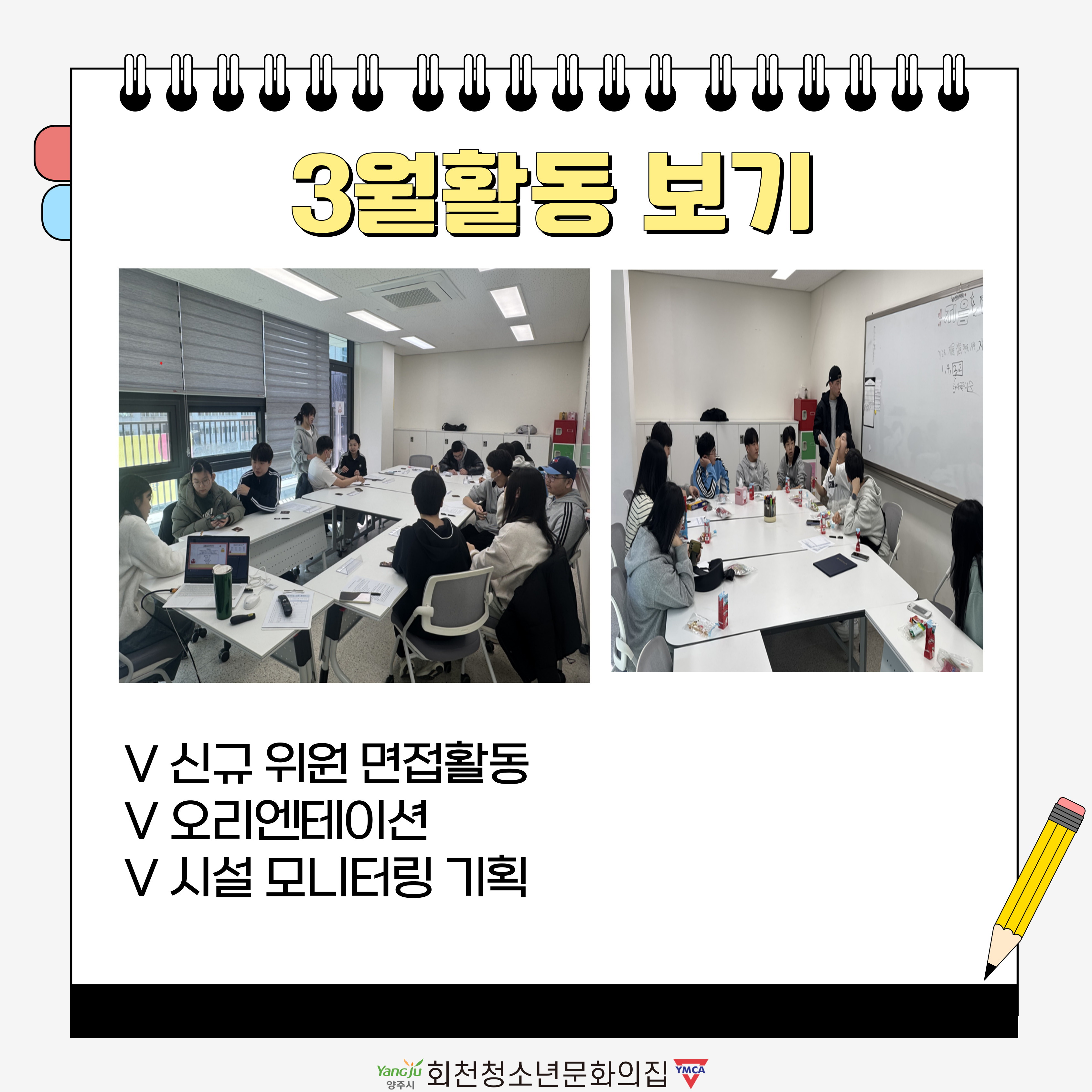 청소년운영위원회 ‘지음’은 3월 한 달 동안 신규 위원 면접, 오리엔테이션, 시설 모니터링 기획 활동을 진행했습니다!