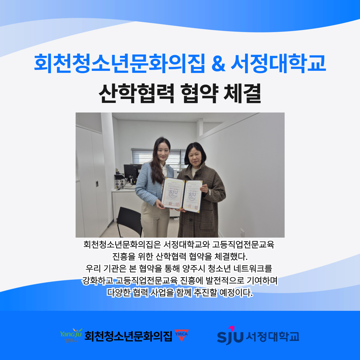 회천청소년문화의집과 서정대학교가 11월 20일, 산학협력 협약을 체결했습니다.이번 협약을 통해 양주시 청소년 네트워크를 강화하고 고등직업전문교육 진흥에 기여하며 다양한 협력 사업을 추친할 예정입니다.