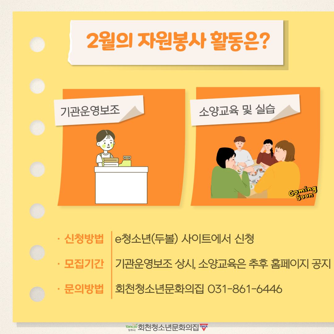 2월에는 기관운영보조와 자원봉사소양교육을 진행하고 실습까지 해보는 활동을 진행해보고자 해요!