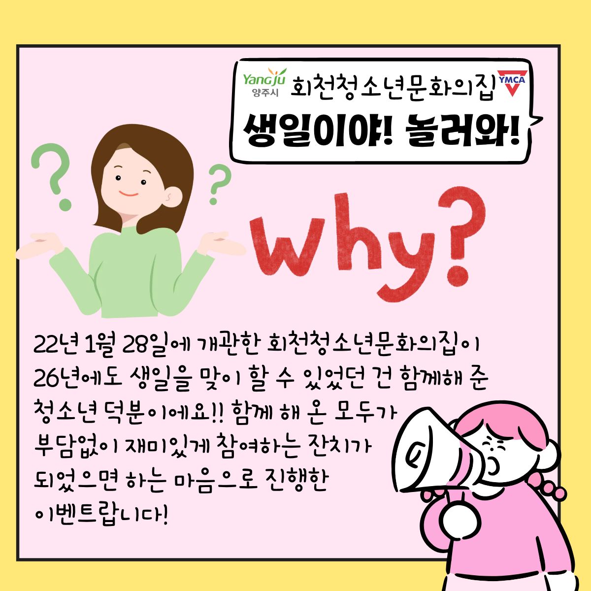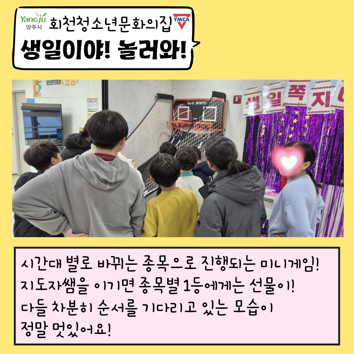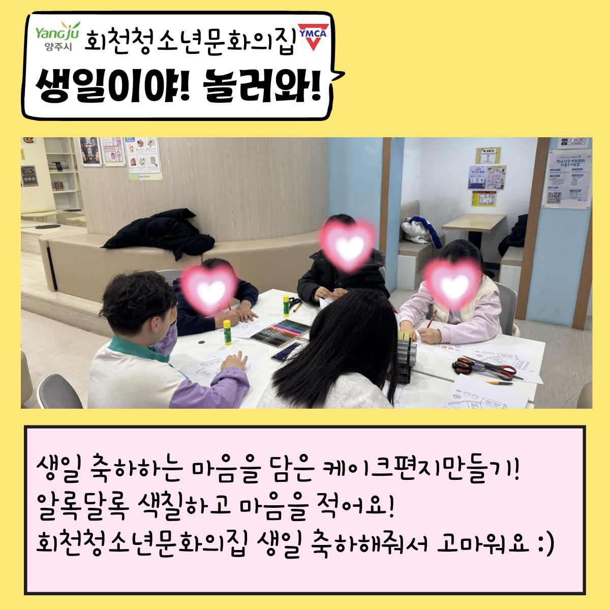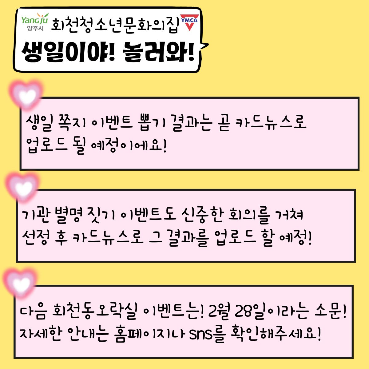 안녕하세요.회천청소년문화의집입니다.여러분 모두 2월 잘 맞이 하고 있나요?우리 1월 말에 함께 했던개관기념이벤트!기관 생일이벤트! 기억해요?그 추억 다시 한 번 살펴볼래요?