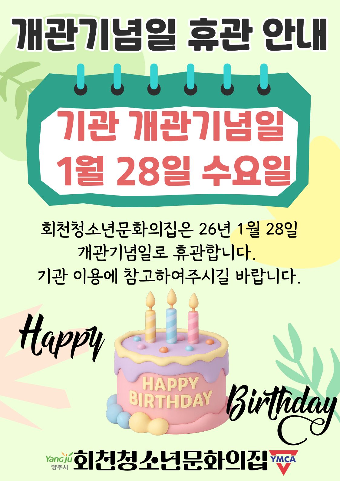 안녕하세요!회천청소년문화의집입니다!1월 28일은회천청소년문화의집의 개관기념일이에요!개관기념일로 해당일은 휴관하오니이용에 참고하여주시길 바랍니다.#회천청소년문화의집 #휴관일