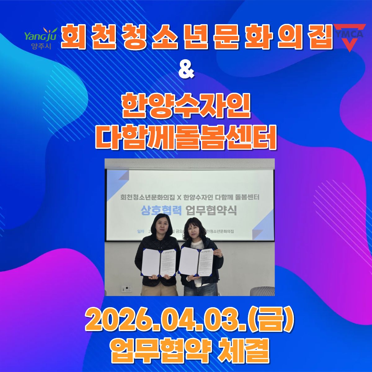 회천청소년문화의집과 한양수자인다함께돌봄센터가 2026년 4월 3일 업무협약을 체결했습니다.상호 긴밀하고도 우호적인 협력을 바탕으로 관내 청소년 및 아동의행복한 일상과 돌봄을 위해 함께 노력하기로 하였음을 알립니다.