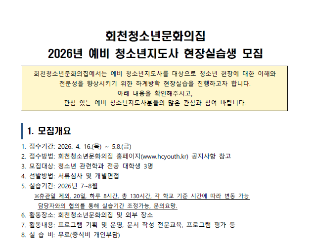 안녕하세요.회천청소년문화의집에서는 2026년 예비 청소년지도사 현장 실습 기회를 제공합니다.관련한 안내사항을 게시하오니희망하는 인원은 붙임파일을 참고해주시면 감사하겠습니다. 2026년 예비 청소년지도사 현장실습 안내 공고문.pdf