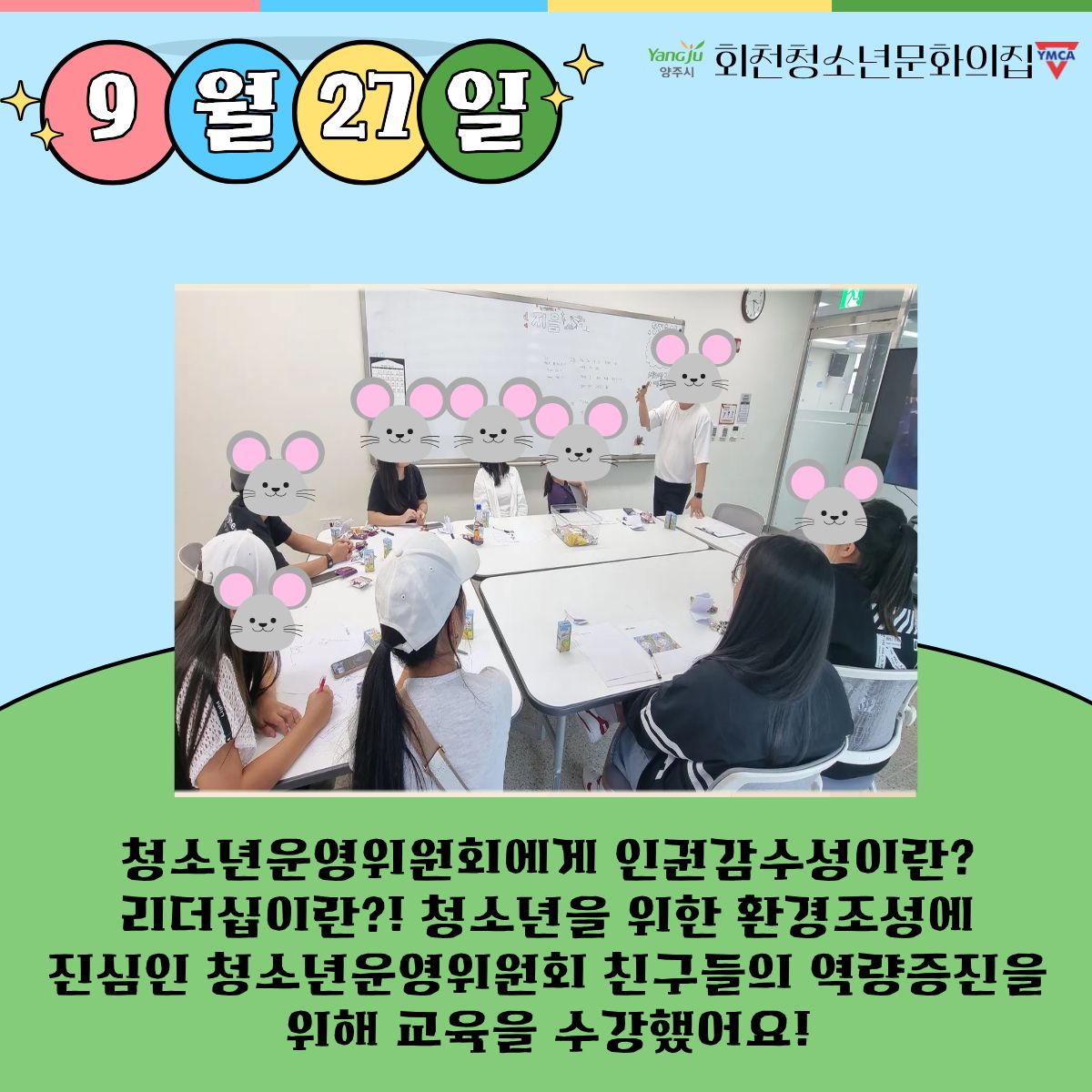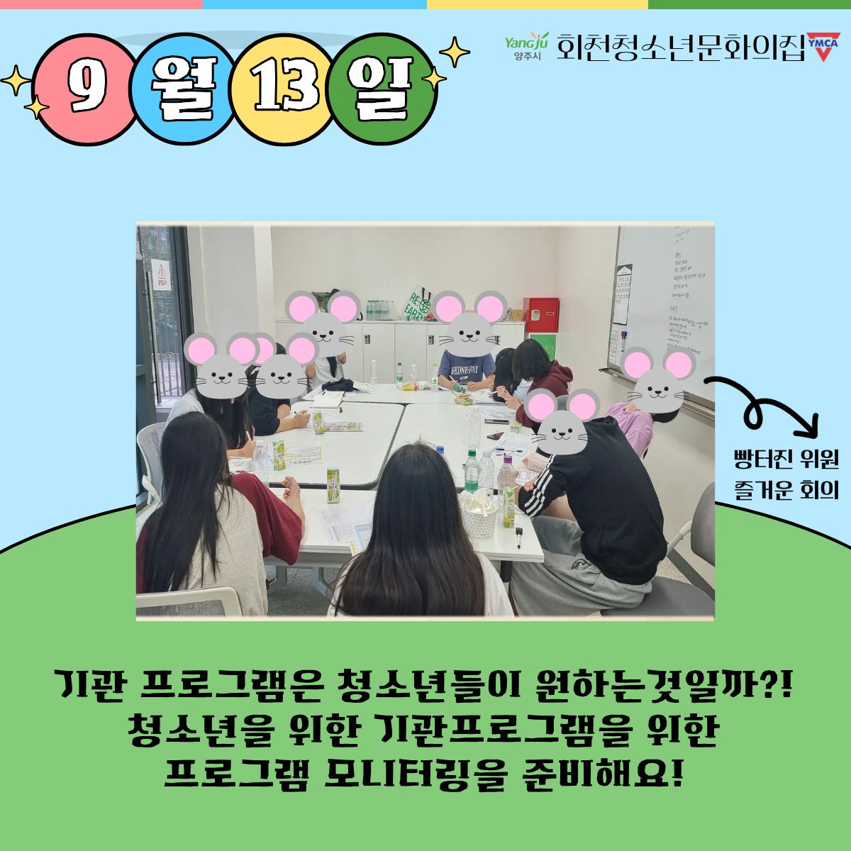 안녕하세요.회천청소년문화의집입니다.9월 청소년운영위원회는!프로그램모니터링 준비와교육 그리고 욕구조사 준비로 바쁜 시간을 보냈답니다!#회천청소년문화의집 #청소년동아리 #청소년 #회천 #옥정 #고암 #덕정 #청소년운영위원회 #지음