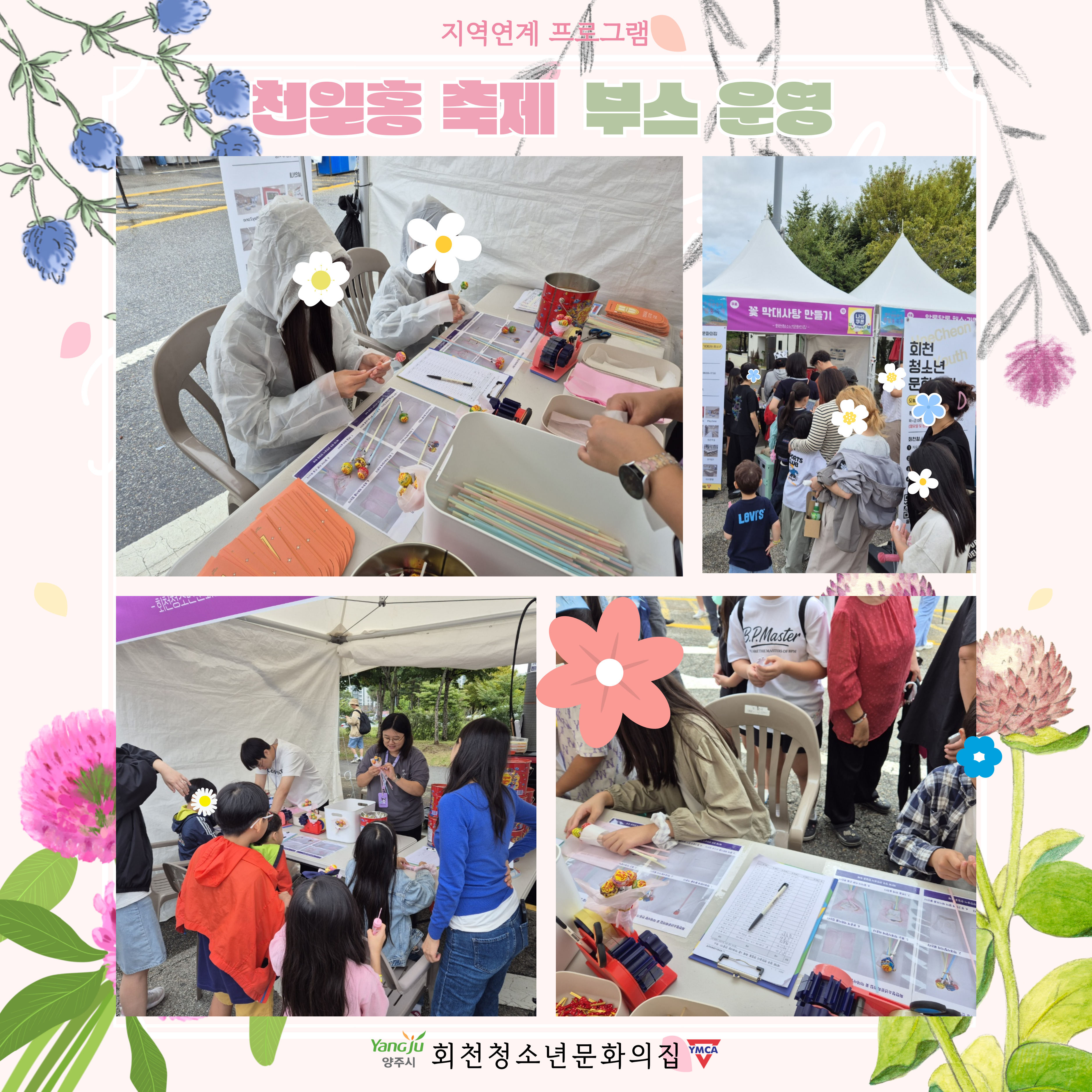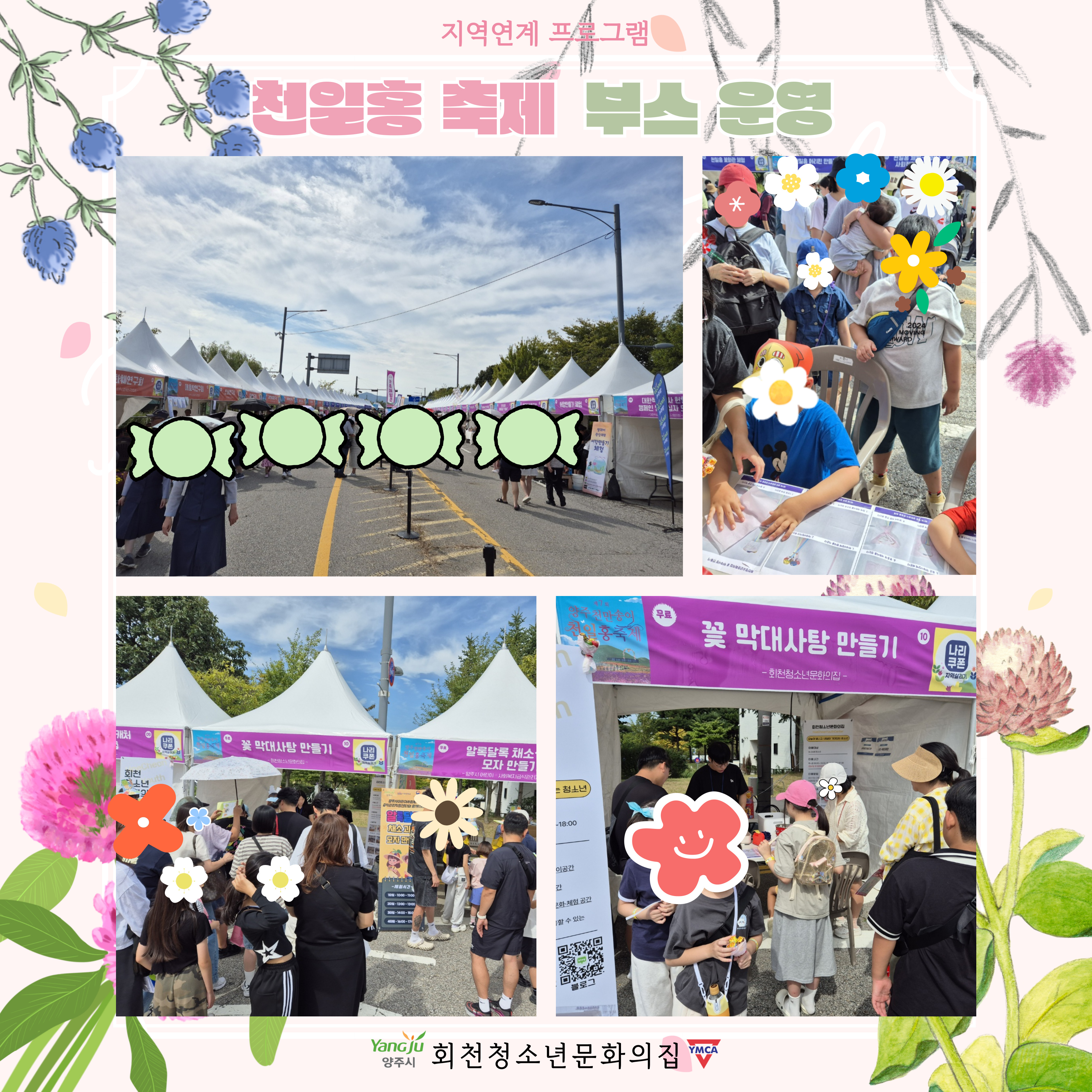 9월 지역연계 프로그램 <천일홍 축제>지난 9월 27~28일, 이틀간양주 나리공원에서 진행한 천일홍 축제에 다녀왔어요.회천청소년문화의집의 부스는 '꽃 막대사탕 만들기' !!막대사탕을 이용해서 꽃다발을 만들어봤답니다>.<줄이 끊이지 않을 정도로 많은 가족들과 아이들이 참여했어요!!즐거운 추억이 되었기를 바라고 다음 소식으로 만나요✋