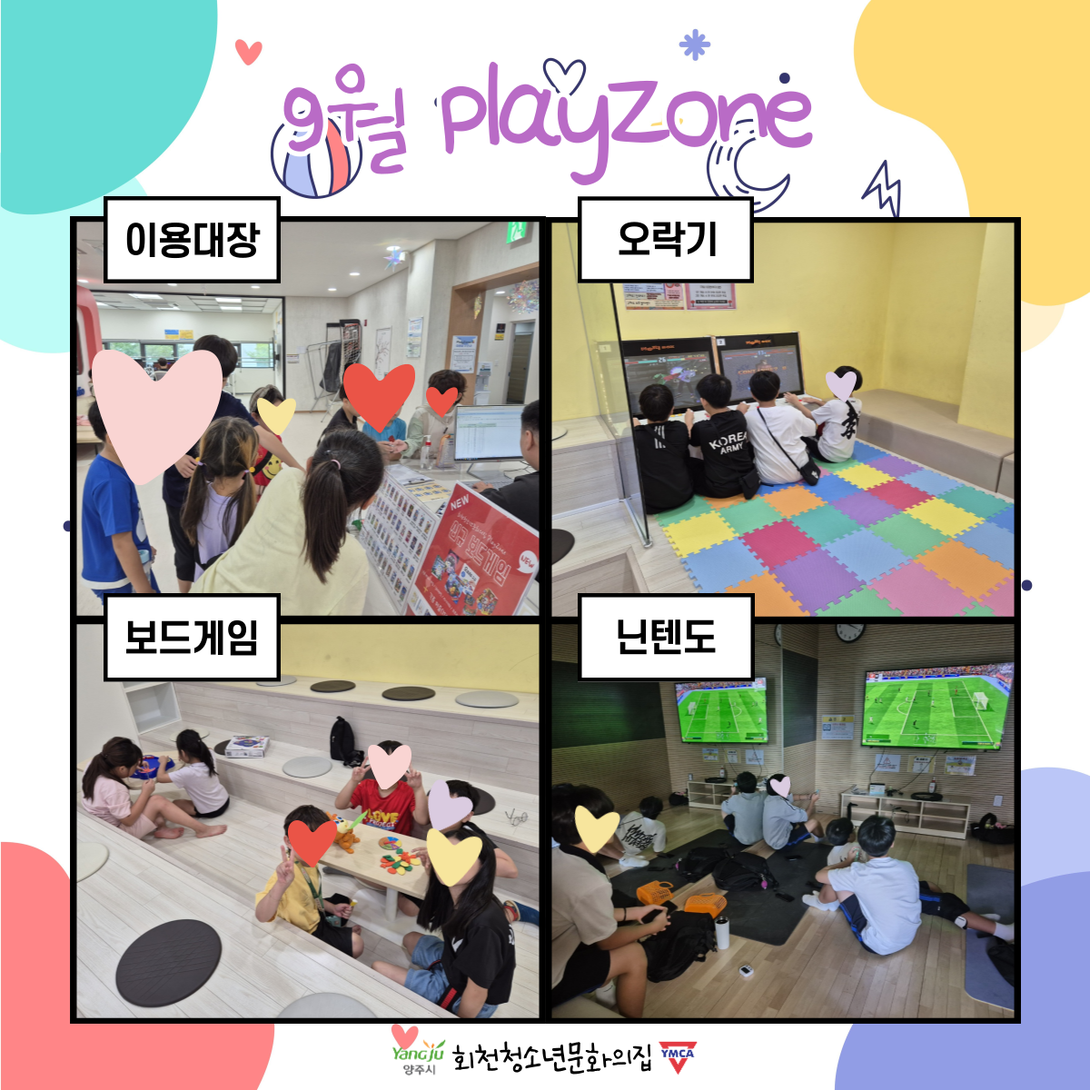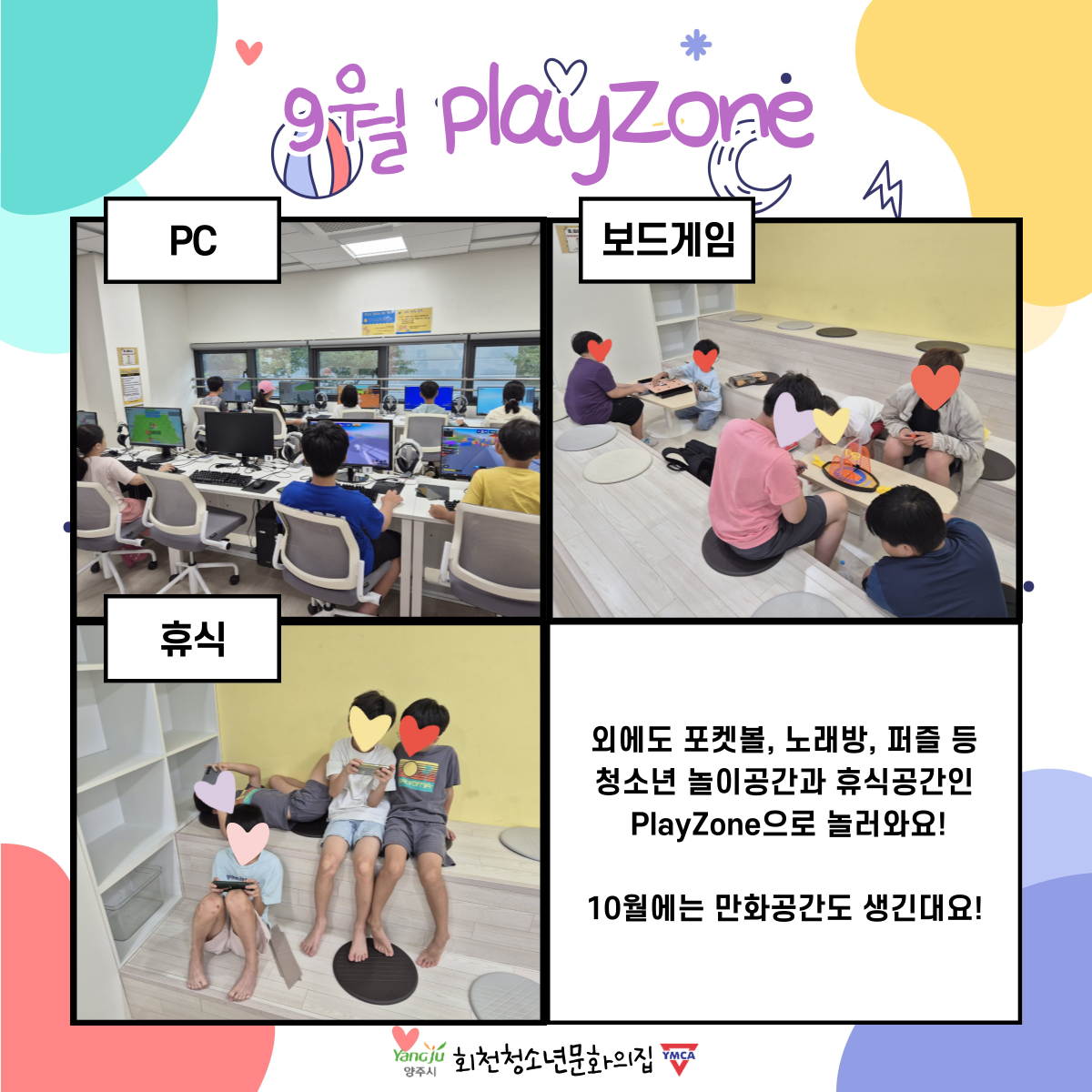 9월의 PlayZone에도 많은 청소년들이 놀고갔어요!항상 인기있는 PC와 보드게임, 놀이시설들을 이용하고, 친구들끼리 모여서 휴식을 취했어요.10월에는 청소년들의 만화공간도 만들어진다고 하니 기대해주세요