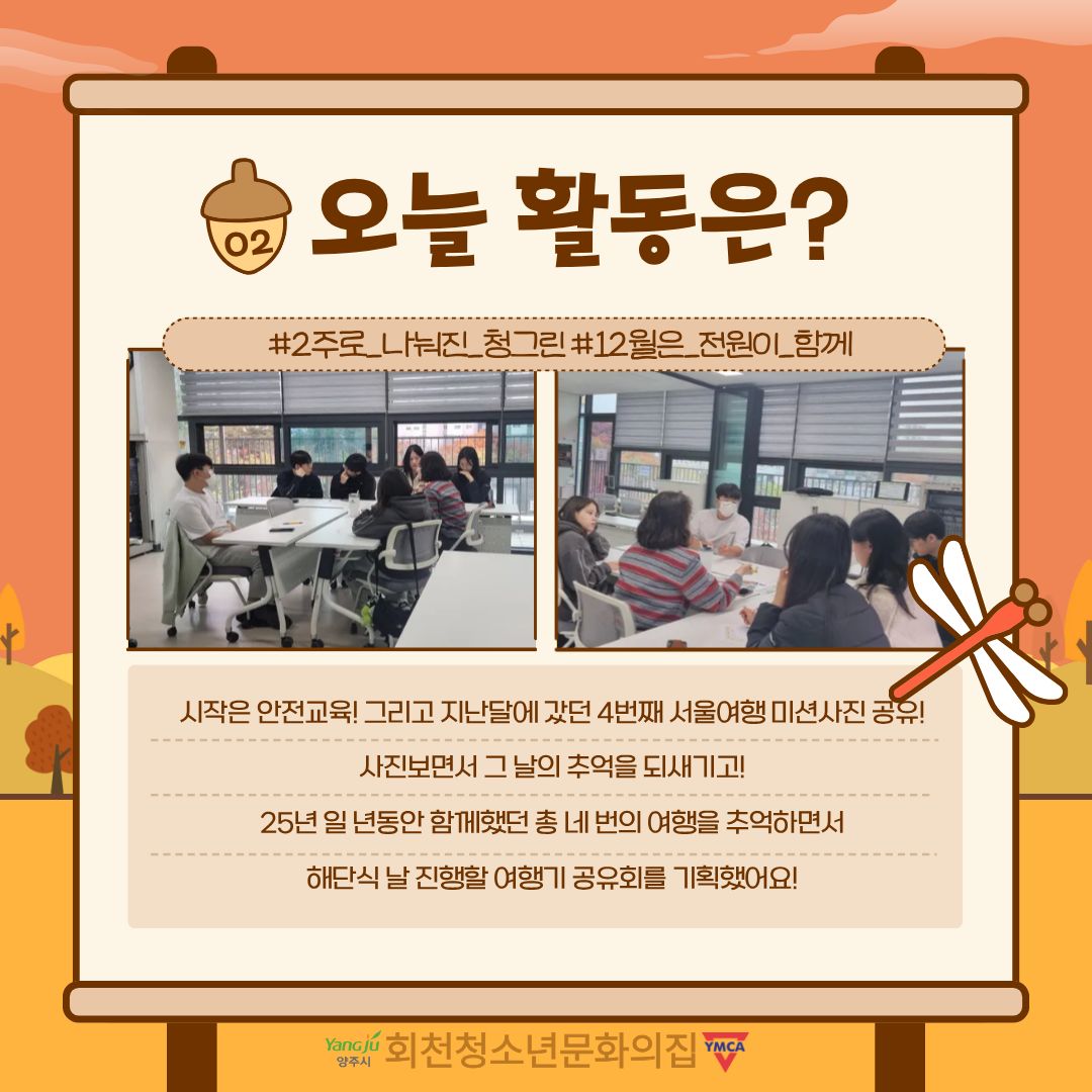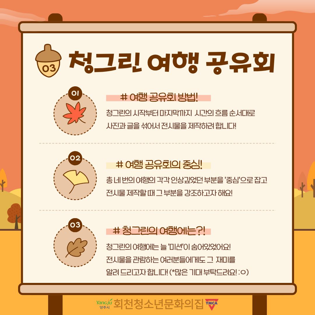 2025.11.8.(토) 13:00진짜 얼마 안남은 청그린 4기 활동 공유!연말 여행 공유회만 남겨두고 있는 청그린 4기! 어떤 방법으로, 중점을 어디에 두고 여행기를 공유할지 기획했어요! 청그린의 마지막 활동! 여행기 공유회 많은 관심과 응원 부탁드립니다!