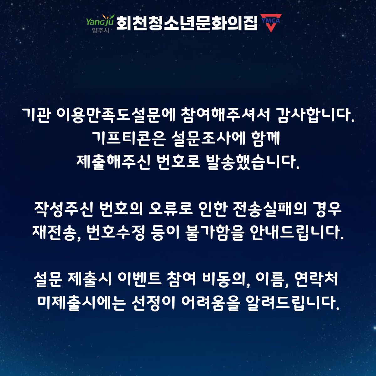 안녕하세요。회천청소년문화의집입니다¡2025년 기관 이용만족도설문에 참여해주신 분들 중정성스러운 답변을 주신 20명을 대상으로 진행되는 이벤트 결과를 안내드립니다!앞으로도 회천청소년문화의집에많은 관심 부탁드립니다.
